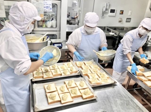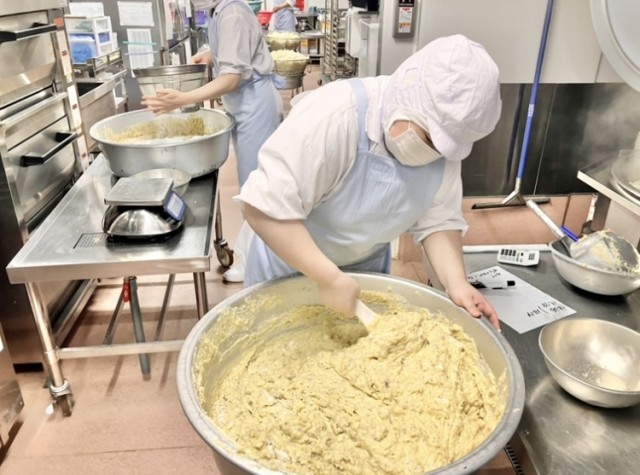 大きなタライ2個分、たっぷり作ったおさつペーストも、780枚のパンに塗りつけるとちょうど良い量に…甘いもの好きな人はもっと欲しいかも?
