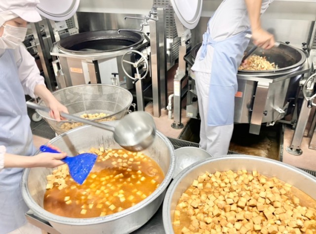 明日は文化祭の舞台発表会。本番を迎える人や実行委員さんはドキドキしているかもしれませんね。今日はドキドキしている時でも食べやすく、消化に良い献立です。乳製品や大豆製品、今日の給食には使っていませんがバナナやナッツ類、鶏肉に多く含まれるトリプトファンは、リラックス時に出されるセロトニンの材料になります。今日は丼にたくさん厚揚げを使いました。また、食べるときによく噛むことは自律神経を整えてリラックス効果が期待できます。よく噛んで食べ、今日は早く寝ましょう。