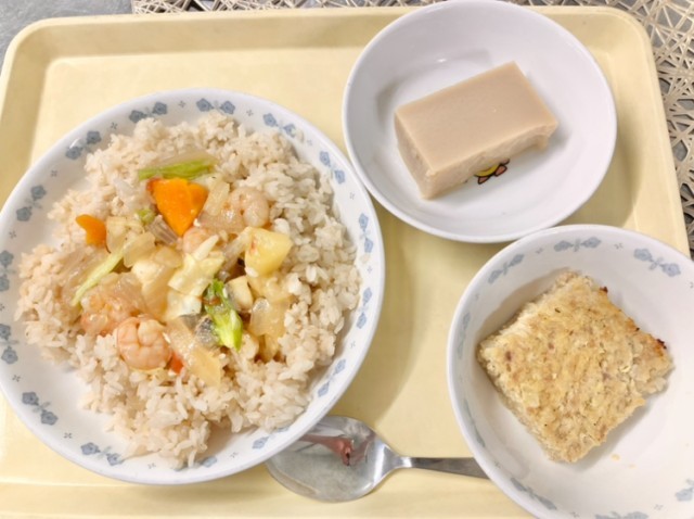 地理の進行に合わせた世界の料理、本日はアフリカ大陸です。チャブジェンは本来炊き込みご飯なのですが、魚介類が多いのもあり給食で提供するのは難しいと判断して作りやすく食べやすい丼にしました。魚の骨で出汁をとり、白身魚を2種類とえび、調味料にナンプラーを使うことで魚介の旨み引き立つ味わいになっています。ルイボスティーは、南アフリカ共和国の西ケープ州、セダルバーグ山脈に囲まれた一帯の海抜450メートル以上の高原地帯で栽培されます。朝夕の温度差や日差しの強さ、年間降雨量など、冬季は0℃夏には48℃にまで上がる気温など、気候条件が大変特殊な場所です。土に豊富にミネラルを含むため、お茶そのものもミネラルが大変多く、独特の風味が特徴です。今日はルイボスティーの風味を味わいつつ、クセが出すぎないように豆乳で割ってゼリーにしました。