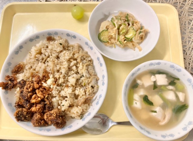 みなさん知っていますか? 鰹節は1人当たり0.6gで、鉄分を0.1mg摂ることができます。 おかかチャーハンは鰹節を1人当たり1.8gとたっぷり使って、旨味と鉄分を補えるように工夫しています。 今日はレバーも組み合わせているので今月の中でも特に鉄分が多く摂れる献立です。鉄分は、体内で酸素を体中に運んでいる赤血球と結合するため、成長期に欠かせない栄養素になっています。 鉄不足は、細胞の酸素不足なのです!>< 成長期は体が大きくなるので血液量も多くなります。 そのため鉄不足になりやすいです。しっかり食べて必要な栄養素を補いましょう。 今年は猛暑の影響でシャインマスカットの出来が良いそうです。しんどかった猛暑もちょっとだけ、良いことありましたね⭐︎
