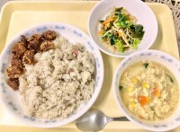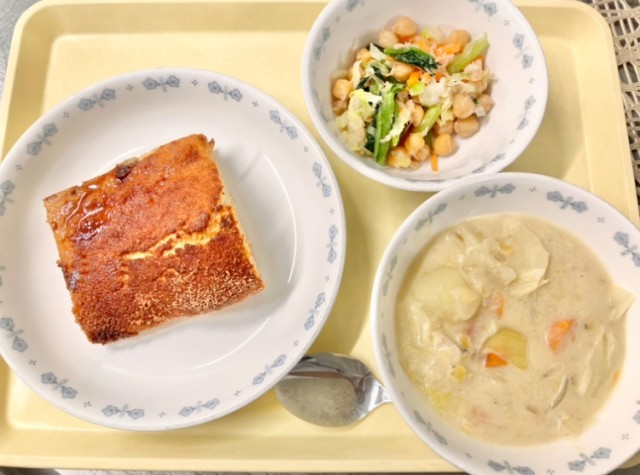 期末考査おつかれさま献立です!今月の手作りパンは甘~いシナモンフォカッチャ。生地には全粒粉を混ぜ込み、鉄分・食物繊維・カルシウムが摂れるように工夫をしました。シナモンの香りにはリラックス・血流を良くし体を温める・胃の調子を整えるなど様々な効果があり、疲れた時に摂取するのに最適なスパイスです。ガルバンゾサラダの「ガルバンゾ」はスペイン語でひよこ豆のことです。豆が苦手な人でも食べやすいように、ひよこ豆は茹でた後、薄口醤油に浸しています。しっかり食べて、期末考査の疲れを明日以降持ち越さないようにしましょうね。