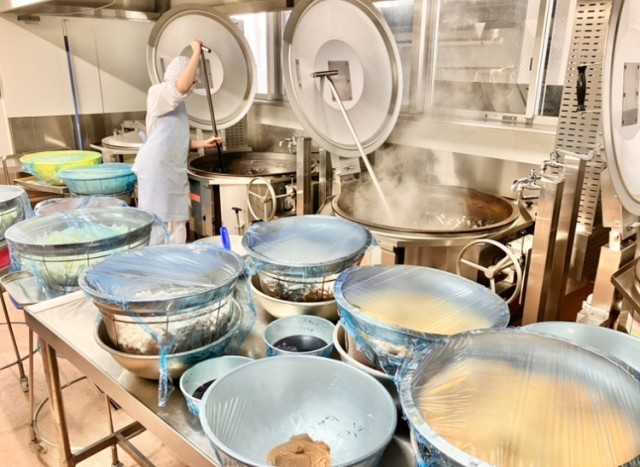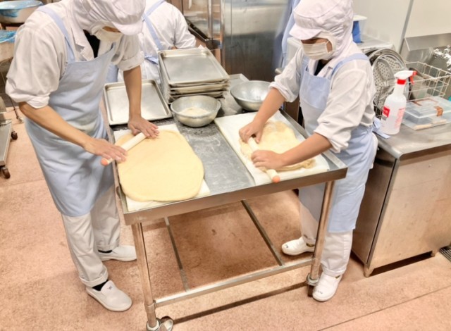 イースト菌の最適な発酵温度が30~40度、夏の給食室はちょうど良かったのですが、さすがに今日は寒くてパン生地もどこか元気がなく…「ふくらめ~」と願いながら生地を伸ばします。