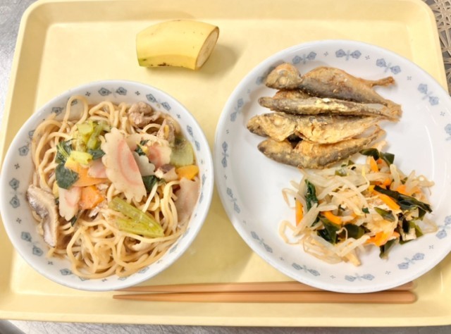 今日は一段と寒いですね。寒くなると心配なのが、風邪や感染症。体を守るためには手洗い・睡眠に加えて、「体を温める食事」を摂ることが大切です。本日の醤油ラーメンは、ラーメン屋さんと同じように鶏がら・昆布・かつお節・青葱を煮出してだしを取っています。このスープには生姜やにんにくなど、体を内側から温めてくれる食材をたくさん入れました。麺と汁を一緒に食べる前提で作るので塩分は控えめで具が多めです。また、まめあじのスパイシー揚げには、たんぱく質のほか、魚に多いビタミンDが含まれます。ビタミンDは骨を強くするだけでなく、免疫の働きを助け、風邪予防にも役立つと言われています。よく噛んで骨ごと食べてもらえると嬉しいです。