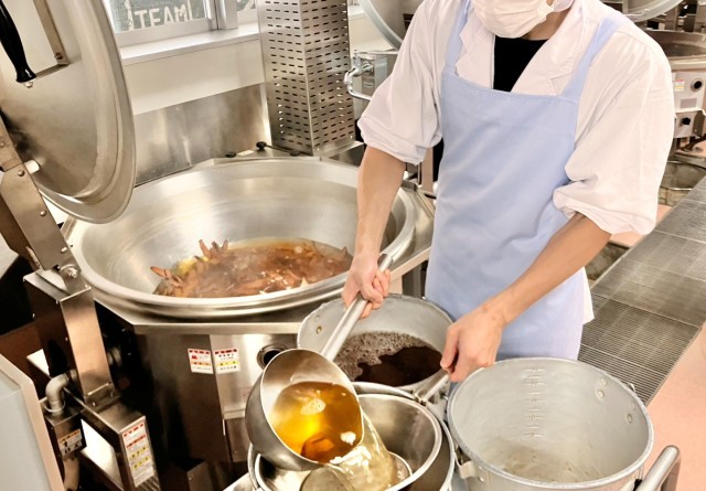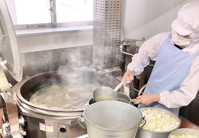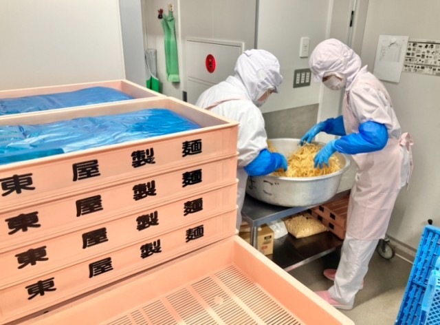 麺は区内の製麺所からとっています。生麺は780食の給食で使うと全部くっついてしまうので蒸し中華麺です。ほぐしてごま油をまぶしながら、異物などがないか確認しています。