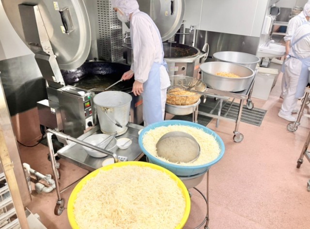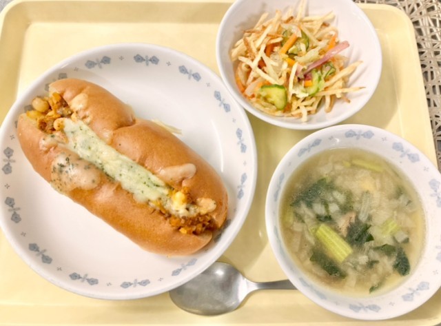 チリビーンズドッグには、鉄分が豊富な大豆とレンズ豆を使い、ひき肉とみじん切りの玉ねぎ・にんじんをじっくり炒めてベースを作っています。そこにチリパウダーでスパイシーな香りをつけ、仕上げにはパセリを混ぜたチーズを乗せて、ふんわり蒸しました。今日のサラダは、墨田区や江東区の学校給食でも人気の「ポテトのハニーサラダ」。揚げたじゃがいもに、ほんのり甘いハニードレッシングを合わせたメニューです。ポイントは、クラスで食べる直前に混ぜること。こうすることで揚げたじゃがいものパリッとした食感がちゃんと残り、よりおいしく楽しめます。また、じゃがいもに含まれるビタミンCは熱に強く壊れにくい性質があるので風邪予防にも効果的です。さらに、ビタミンCには鉄分の吸収を促進する効果があります。しっかり食べて今週一週間もがんばりましょう〜