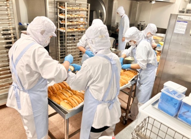ドッグカットにしたパンの外側に具がつかないように、1人が開いて1人が具を詰めます。具を詰めたら中心にチーズを乗せます。1つ1つ780個作りました。