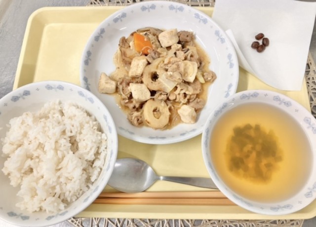 今年度は内田先生に相談して、国語の教科書に登場する文豪にちなんだ文豪給食にチャレンジすることにしました。第一回目は森鴎外です。森鴎外は食事に数々のこだわりがあったことで知られています。温泉まんじゅうをごはんにのせ、お茶をかけて食べる独特な「お茶漬けまんじゅう」や刺身を加熱する「刺身のにつけ」などが有名です。今日の給食では、その雰囲気を再現するため、温泉まんじゅうの代わりに少量ですが小豆の甘納豆を添えました。ごはんとは別に食べても良いし、鴎外にならってお茶漬けに組み合わせてみてももちろんOKです。また、彼は軍医としての経験から生食を避け、しっかり火を通すことを大切にしたとも言われています。豚鍋風は、具材を加熱してうま味を引き出し、安全においしく食べられるように工夫しています。作品だけでなく、食の面からも文豪のこだわりに触れてみましょう。