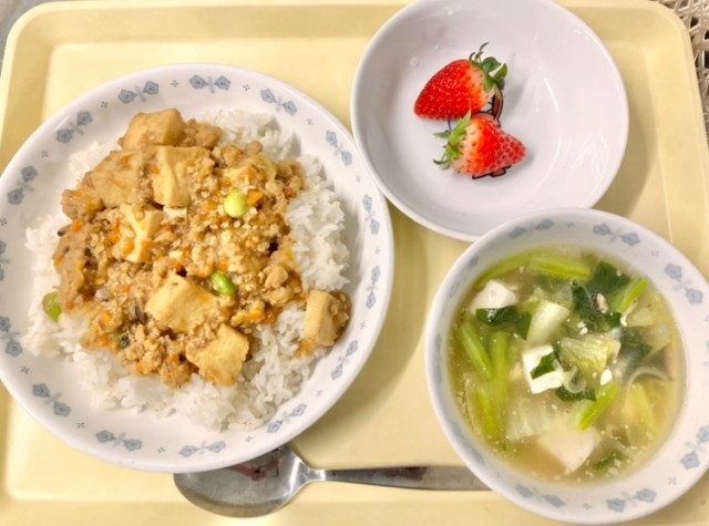 厚揚げは成長期に欠かせないカルシウムと鉄分が豊富に含まれています。特に鉄分は血液の材料になるだけでなく、全身の細胞に酸素を届ける「運搬役」。不足すると、細胞が酸素不足の状態になり、だるさ・集中しにくさ・立ちくらみなどにつながります。成長期の中学生は体の体積や運動量が増えて特に消耗しやすいので、鉄分は日頃から意識して補いたい栄養素です。デザートのいちごに多く含まれるビタミンCは、なんと鉄分の吸収率を高めてくれる働きがあります。一つのおぼんで組み合わせて食べることにより効率よく鉄分を体に取り入れることができます。さて、ご存知ですか?露地栽培のいちごの旬は2〜3月ですが、クリスマス需要があるため、ハウス栽培のいちごは12月から出回っています。しかし、15日を過ぎると値段がはね上がるので給食では早めのいちごをお届け!鉄分たっぷりの厚揚げと、吸収を後押しするビタミンCのいちご。今日の組み合わせで、しっかり元気をチャージしましょう。