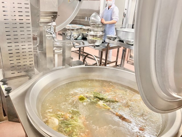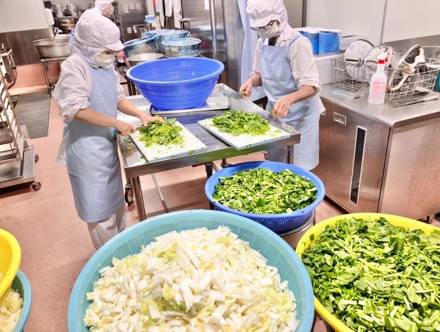 微塵切りなどは機械で切れますが、白菜や小松菜などの繊細な野菜は全て包丁で切っています。火の通り方なども意識しながら、皆さんが食べやすい大きさに切ります。