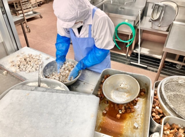 鰹は魚屋さんに食べやすいサイコロカットをお願いし、6面全てに均一に衣をつけるためにザルで軽くふるいながら作業を進めます。衣が不均一だとこの後タレに絡めるのにムラができてしまうからです。