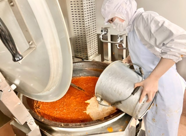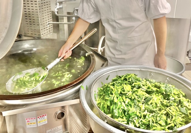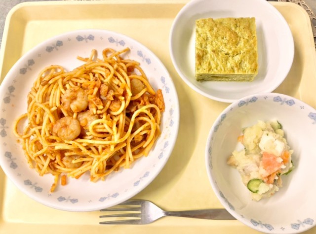 えびのトマトクリームパスタは新メニューです。トマト缶を煮詰めて酸味を抑え、うまみを引き出し、豆乳クリームとペーストにした白いんげん豆を使うことで脂質は控えめでも濃厚なパスタソースに仕上げました。パスタだけではたんぱく質が不足するため、ポテトサラダにはドレッシングでマリネした鶏肉と豆を加えています。小松菜ケーキは区内の越塚農園さんが育ててくださった旬の小松菜をたっぷり使い、豆腐をベースに、全粒粉やきなこも使うことでタンパク質・鉄分・カルシウム・食物繊維を補う栄養価の高いデザートになりました。今日のようなパスタなどの小麦製品が主食となるの食事は、和食と比べて食物繊維が少なくなりがちです。そのため、豆・野菜・全粒粉などを組み合わせることが大切になります。あと1週間で始まる冬休みは、自分で食事を選ぶシーンも増えるかと思いますので、たんぱく質や食物繊維が十分に取れるよう、意識できると良いですね。