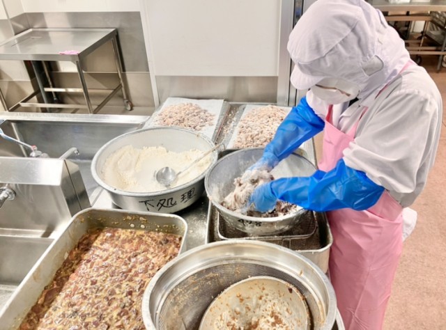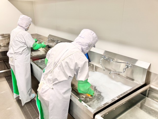 給食室では道具の使い回しは一切せず、使ったボウルや食具は全て洗ってしまいます。そのため炒めたり煮たり、調理作業を進めている間にも洗浄室で洗い物を進めなくてはいけないのです。