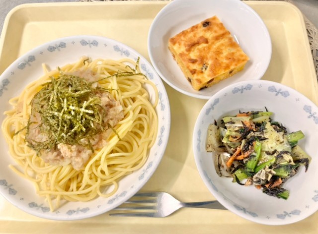 ツナとおろしの和風スパゲッティは、練馬区で地域おこしの一環として考えられた料理がもとになっています。練馬区の特産品である大根の魅力を多くの人に知ってもらうため、和食の食材とスパゲッティを組み合わせ、親しみやすいレシピとして生まれました。本日の給食では一般的な青首大根を使用しています。レシピがシンプルなので大根が美味しい季節にしか出せない、貴重なレシピです。ひじきサラダには区内小松菜農家の越塚さんが育ててくださった美味しい小松菜を使っています。小松菜はカルシウムや鉄を多く含み、成長期の体づくりに役立つ野菜です。キャロットケーキには水分の代わりに豆腐をペースト状にして加え、たんぱく質と鉄分を補いながら、もちもちとした食感に仕上げて旬のにんじんをスイーツとして味わいます。地域の食材や工夫を盛り込んだ献立を味わいながら、食と健康、地域とのつながりについて考えてみるのはいかがでしょうか。