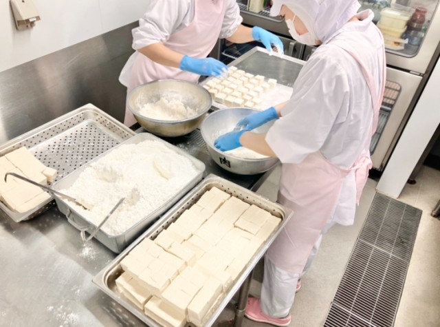1人2個の揚げ豆腐は、6面全てに薄付けの衣をつけるのが美味しさのポイント、ということは全校で9,360面!2人の調理師さんだけで綺麗につけてくれました。