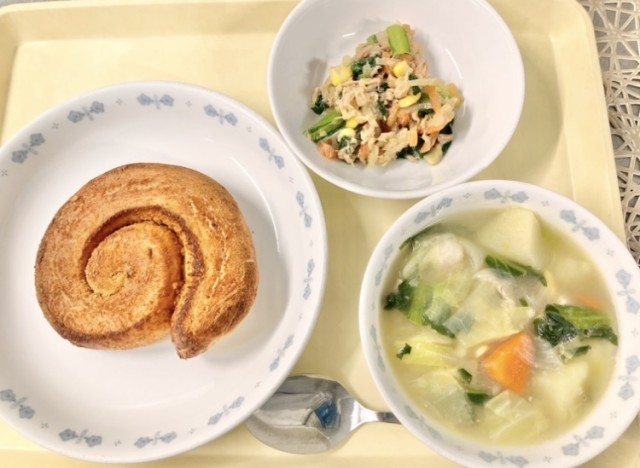 きなこは、大豆を炒って粉にした食品で、たんぱく質だけでなく食物繊維も豊富に含まれています。きなこや野菜に多く含まれる食物繊維は腸の動きを助け、腸内環境を整えるはたらきがあります。腸は、体の中で免疫に関わる細胞が多く集まる場所で、腸内環境を良好に保つことが、体調管理につながると考えられています。花粉症や感染症が気になるこの時期は、体の中から土台を整えることが大切です。今日の手作りきなこロールは、生地とロール部分の両方にきなこを使い豆乳と組み合わせ、和の雰囲気を生かした手作りパンです。今日は室温が低く、イースト菌の発酵が夏よりも活性化しなかったため少し小さく焼き上がりました。その代わり、むっちり密度の濃いパンになっています。しっかり噛んで味わってください。