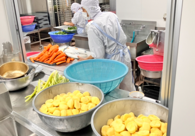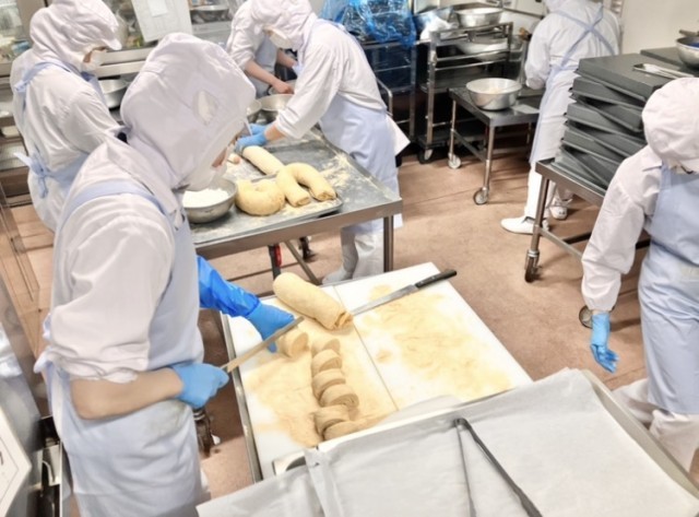 手作りロールパンは、生地をよく練りこね上げたのち四角く伸ばして具材を巻いた1本のロールから16人分を切り分けます。本日は2年生がいないので520人、約33本のロールを作利ました。