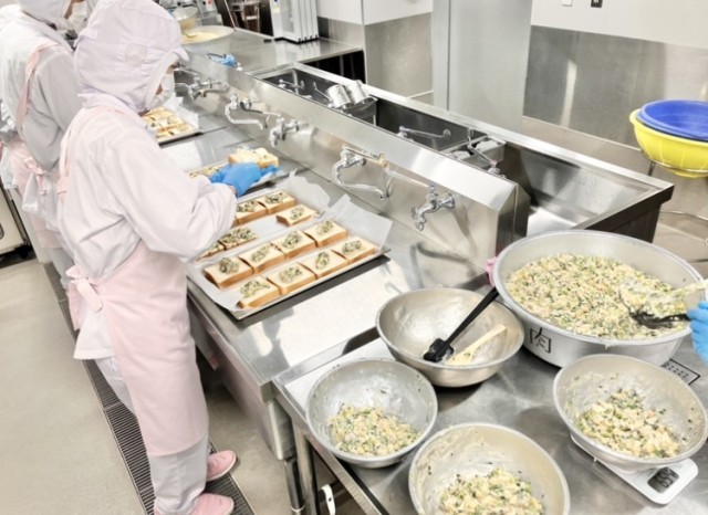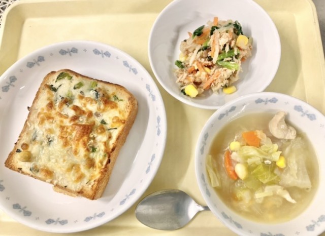 小松菜グラタントーストは新メニューです!小松菜はカルシウムを多く含む緑黄色野菜で、骨や歯を丈夫にする働きがあります。今日の小松菜も区内の越塚農園さんが育ててくださったものです。グラタンの具には、豆類の中でもカルシウムを多く含むひよこ豆を加えました。カルシウムというと骨や歯のイメージばかりありますが、実は生命維持に関わる心臓や筋肉、神経のはたらきを助けるために血液中でも使われています。不足すると体は骨のカルシウムを使ってでも血液のためのカルシウムを補おうとするため、骨が弱くなってしまいます。成長期は骨がつくられる大切な時期だからこそ、毎日の食事でこまめにカルシウムをとることが重要です。今回は豆乳を使い、米粉でとろみをつけることで脂質を控えつつ、カルシウムをたくさん摂れるように工夫しました。しっかり食べて週の始まりを元気にスタートしましょう!