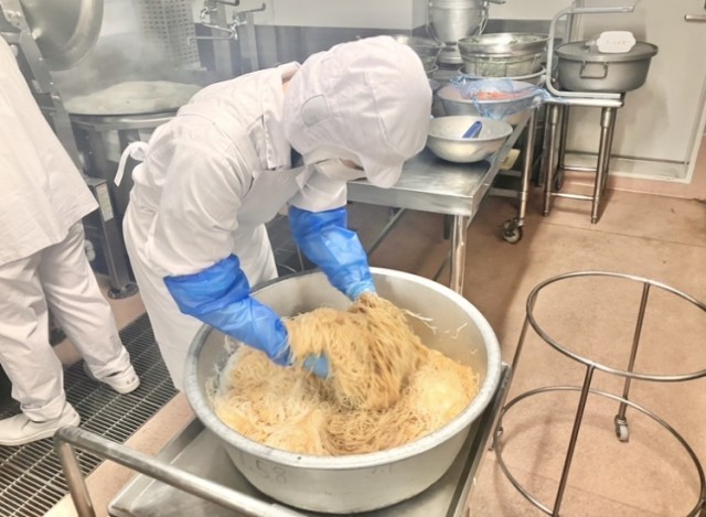 韓国風炒飯はコチュジャンで味付けした豚肉に、刻み海苔をごま油と塩で和えて韓国海苔風に調理した海苔とチーズを入れました。本当はチーズは溶けるチーズなのですが、給食で均一に提供するのが難しいのでサラダチーズを使っています。トックスープの出汁は、鶏の骨を煮込んで取る鶏がらスープが決め手です。少し多めの骨を使って長めの時間煮込み、濃い出汁を取りました。胸肉の竜田揚げはすりおろした野菜に漬け込むことで、野菜の酵素で肉を柔らかくしています。たくさん食べて週の始まりを元気にスタートしましょう。