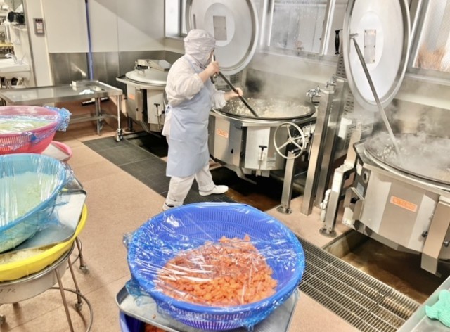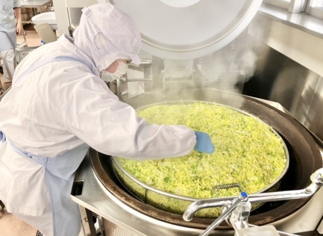 バーガー用のキャベツは春キャベツになってきたので本当に短時間さっと蒸すだけで甘さ引き立つ味わいに。写真は、中心温度を測っているところです。