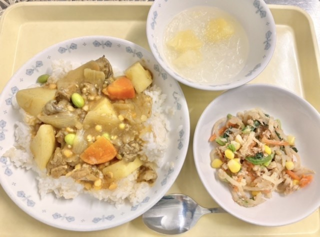 今年度の給食が始まりました🌸レシピを担当するのは栄養教諭の菅原、調理を担当するのは協立給食株式会社の調理師の皆さんです。さて、給食開始日はカレー!という学校は多いのではないでしょうか。配膳しやすく食べやすいカレーは、初日にぴったりのメニューですね。こまちゅうのレシピは角切りの鶏もも肉をスパイスに漬け込んで、表面のみをこんがり焼いてから煮込むこだわりレシピです。4月の献立表で⭐︎マークがついている献立は、昨年度2月に「新1年生に食べさせたい&新2・3年生が食べたい給食」という食育掲示イベントで上位5票以上を獲得したものです。本日はチキンカレーとクラッシュサイダーゼリーを選出しました。