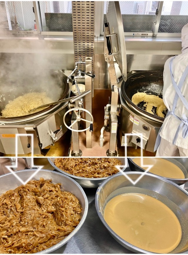 朝1番にじっくり時間をかけて作るのはカレーの味の決め手となる飴色玉ねぎとルウです。この2つが「給食のカレー」の風味を決めていると言っても過言ではありません。