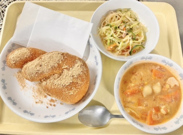 張り切っているけど疲れてくるであろう給食2日目は揚げパンです。1年生はパンの大きさが大きくてびっくりするかもしれませんね。中学生は人生で2番目に体重あたりの成長量が多い時期です。しっかり食べて勉強や運動に励みましょう。春雨サラダは「新1年生に食べさせたい&新2・3年生が食べたい給食」で上位5票以上を獲得したメニューです。さて、1階の食育掲示版は見ていただけましたか?季節や学校行事に合わせて、1・2ヶ月に内容を変えていますのでぜひ見てみてくださいね。4月は給食・食育の目標をメインに掲示しました。給食は「ただのお昼ごはん」ではなくみなさんの健康を守る「生きた教材」として運用されるよう、文部科学省によって7つの目標が示されています。①健康の保持増進 ② 食事について正しい理解・健全な食生活を育む判断力・望ましい食習慣 ③ 明るい社会性と協同の精神 ④ 生命、自然を尊重する精神や環境の保全に寄与する態度 ⑤ 食生活が多くの人々の勤労に支えられていることへの理解と感謝 ⑥ 伝統的な食文化への理解 ⑦ 食料の生産、流通及び消費についての理解・・・毎日、この目標の1つ以上は達成できるように献立を組んでいます。少し意識してみてくださいね。