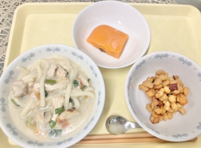 白湯塩うどんは「新1年生に食べさせたい&新2・3年生が食べたい給食」で上位5票以上を獲得したメニューです。白湯の読み方は「さゆ」ではなく「ぱいたん」です。鶏の骨をぐつぐつ煮込んで白く濁った濃いだしをとり、ちくわや油揚げも入れた旨味たっぷりの煮込みうどんです。キャロットゼリーは、にんじんのすりおろしをたくさん使っていますが、オレンジジュースを加えることでにんじん特有のにおいを抑え、食べやすく仕上がっています。さて給食も5日目、準備は慣れましたか?いろいろな材料の良さが合わさって給食がおいしくなるように、配膳や片付けも声をかけ合いながら協力することで、気持ちよく進めることができます。自分の役割を大切にしながら、周りの人と助け合って準備をしていきましょう。