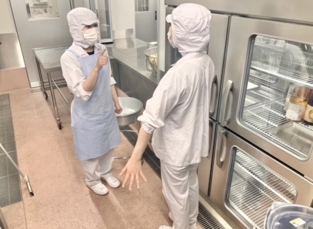調理師さんの身支度チェックは朝礼の9時と、調理中の11時の2回行います。2人1組になって、手指に怪我や手荒れはないか、帽子・白衣・マスク・ズボンに糸くずや髪の毛がついていないかを確認します。