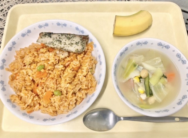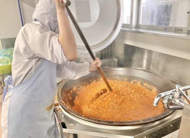 チキンライスは先輩の栄養教諭に教わったレシピで、ケチャップのみが調味料です。「企業努力の結晶であるケチャップのうまみを最大限引き出す」このレシピは限界まで煮詰めたケチャップとほぼ加熱しないケチャップを分けて加えるのがポイントです。