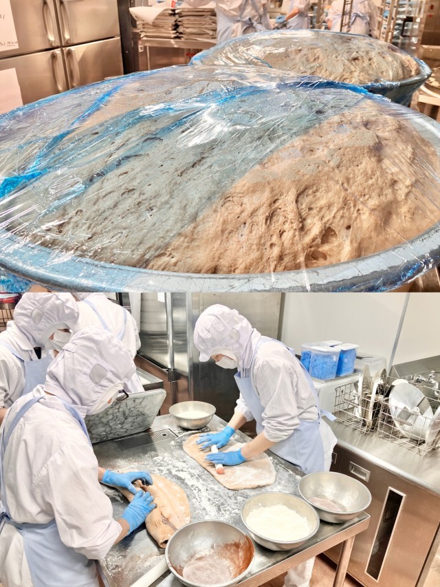 手作りパンの生地はその日の湿度や温度で膨らみ方が変わります。今日は少し暖かいのでたらいから溢れんばかりの膨らみ方です。これを16人分のロール生地にし、切り分けて、成型していきます。