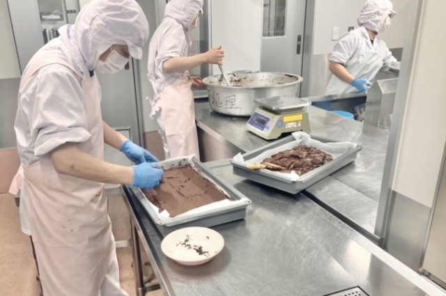 醤油ラーメンとブラウニーは「新1年生に食べさせたい&新2・3年生が食べたい給食」で上位5票以上を獲得したメニューです。醤油ラーメンは、ラーメン屋さんのように鶏の骨と煮干し、鰹節、昆布を使ってだしをとっています。お店のものと違うのは塩分です。学校給食は、みなさんが健康に成長できるように栄養価が細かく決められています。特に、過剰摂取により生活習慣病のリスクがグッと上がる塩分は、日常的に摂りすぎている人が多いので基準値がとても低く設定されています。そのため、給食のラーメンは塩分控えめでもおいしく感じてもらえるように、だしを濃いめにとり、具もたくさん入れて作っています。一般的なラーメンは全体の塩分が7g程度ですが、給食のラーメンは1杯2g程度の塩分です。麺を食べながらスープを飲んでちょうど良いくらいの塩分にしてあるので、たくさん食べてくださいね。ブラウニーは、一般的には卵やナッツ類を使うケーキですが、今回は卵もナッツも入れずに作る、アレルゲンフリーのケーキです。卵やナッツがなくてもコクを感じられるように、豆腐でどっしり感を、はちみつで香りと甘みをプラスしています。