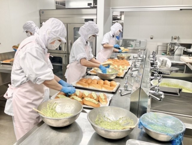 小松菜を硬めに茹でてミキサーにかけ、砂糖やマーガリンで作ったビスキュイ生地と合わせたあと、1個分の量を計算し、770個のコッペパン1個1個に塗っていきます。