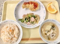 二枚目の写真*月曜日は誰しもが少しおつかれモード、野菜をたっぷり使ってビタミンチャージ、でも「The野菜」という感じの献立にならないようにしています。調理師さんたちは朝早くから大量の野菜を洗ったり切ったり大忙しです。