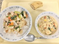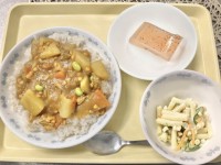 枝豆ごはん、酢豚、冷製すまし汁、牛乳