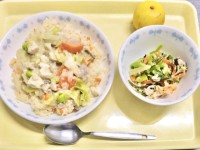今日は滋賀県の郷土料理です。滋賀県は、精進料理のバリエーションが豊富で、豆製品を使った郷土料理がたくさんあります。本日汁物に使用した打ち豆は、大豆を蒸して、木づちで一つ一つ潰して花型にし乾燥させたものです。雪の多い湖北地域を中心に広がっています。福井県や石川県、新潟県などでも食べられてきた食材です。(滋賀県の郷土料理についての詳しい説明は次のHPをご覧ください)