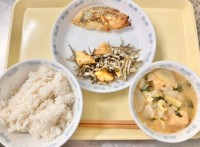 ◯牛乳◯ごはん◯ボラの竜田揚げ風◯小魚とじゃがいもの揚げがらめ◯玉ねぎと厚揚げ...