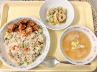 ◯牛乳◯小松菜チャーハン◯レバーの辛味揚げ◯切り干し大根のナムル◯トックスープト...