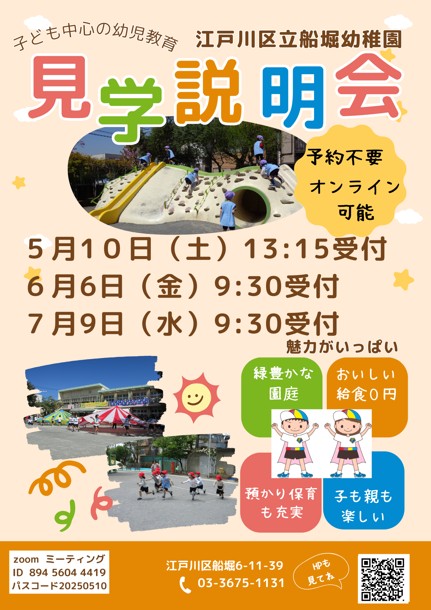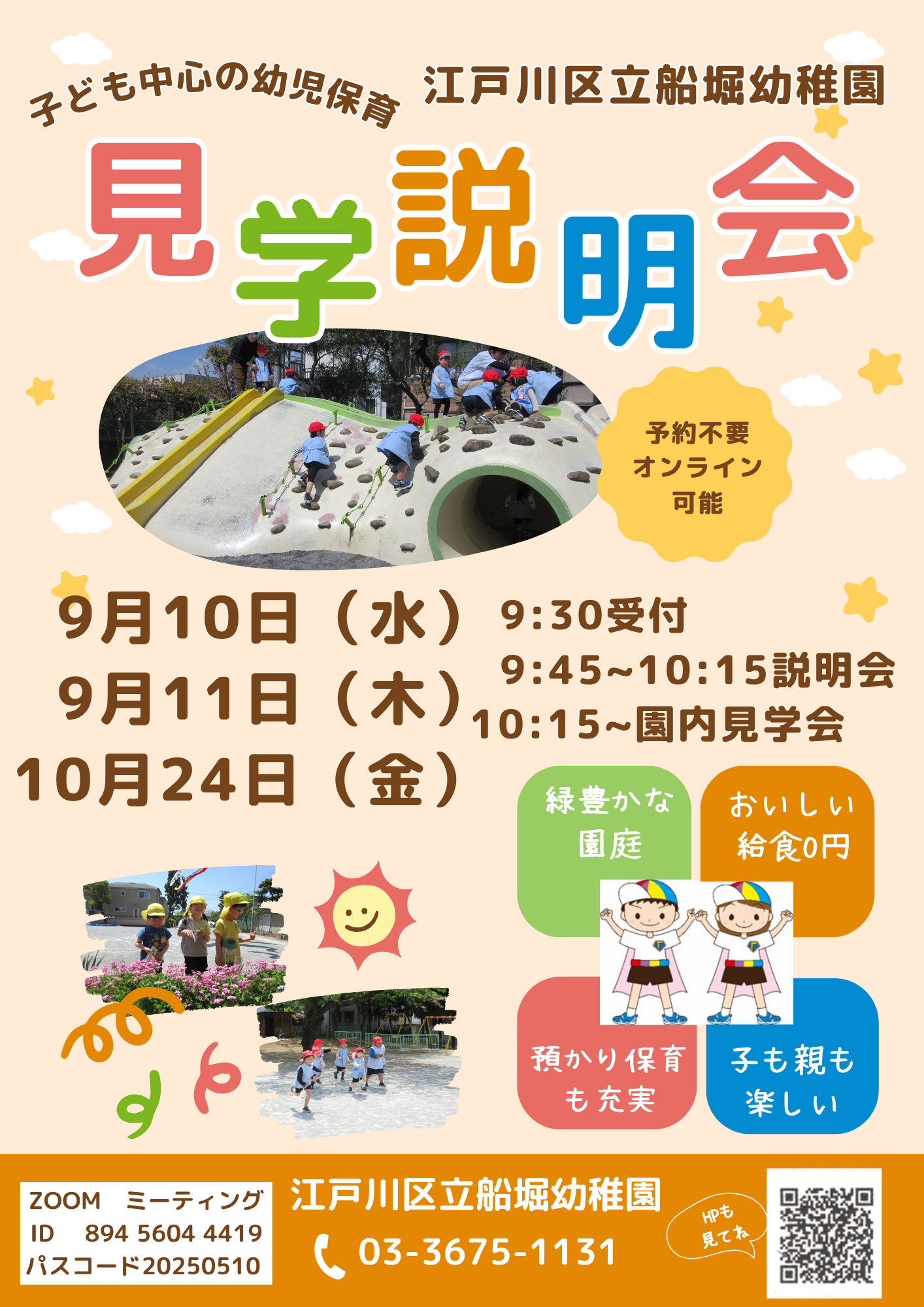幼稚園見学説明会を実施します。全体の説明後に園内を見学できます。予約不要です。 ズームによるオンライン配信も実施します。ミーティングⅠⅮとパスコードを入力してください。