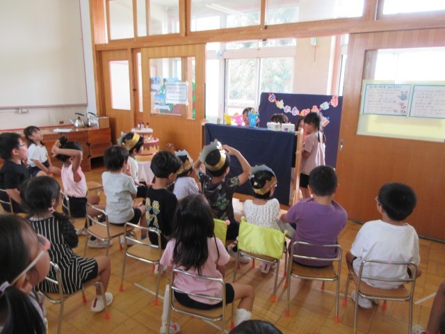 今日は9月の誕生会。星の組では折り紙で作った動物の人形劇をしてくれました。