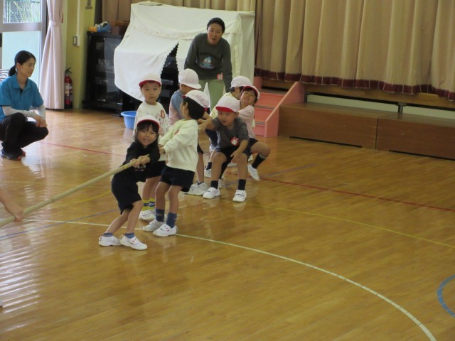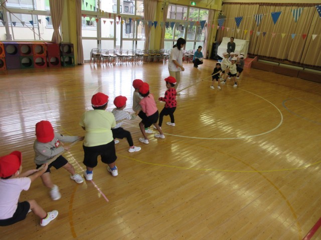 ばら組はホールでつなひきをしました。星の組さんを見て、やりたい気持ちがいっぱいだったばら組さん。