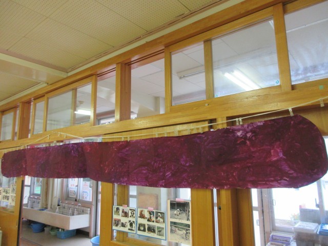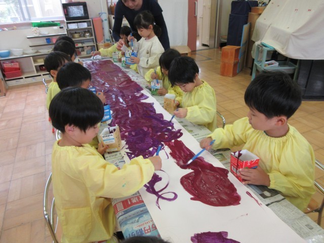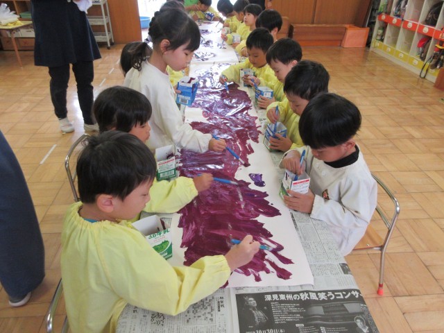 遠足が雨天延期になってしまったばら組。大好きな絵本『おおきなおおきなおいも』を読み、絵の具でおおきなおいもを描きました。