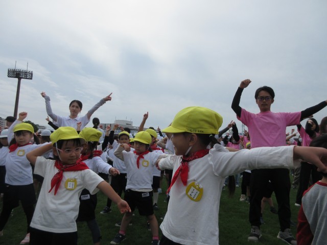 星の組はさわやか体育祭に参加しました。開会式ではみんなでダンス。LDHのラキの方たちといっしょに楽しく踊りました。