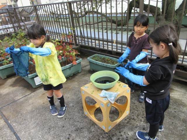 星の組が育てて干したアイの葉を使い、染め物をしました。
