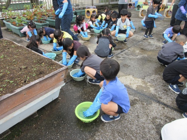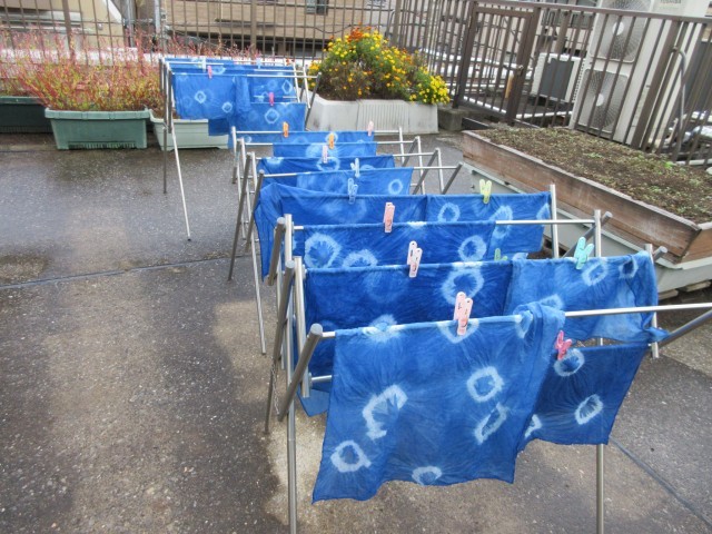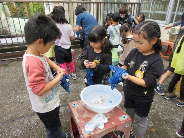 ビー玉を付けた輪ゴムを外すと模様が出てきて「きれい!」と喜んでいました。藍染めはとてもいい体験になりました。