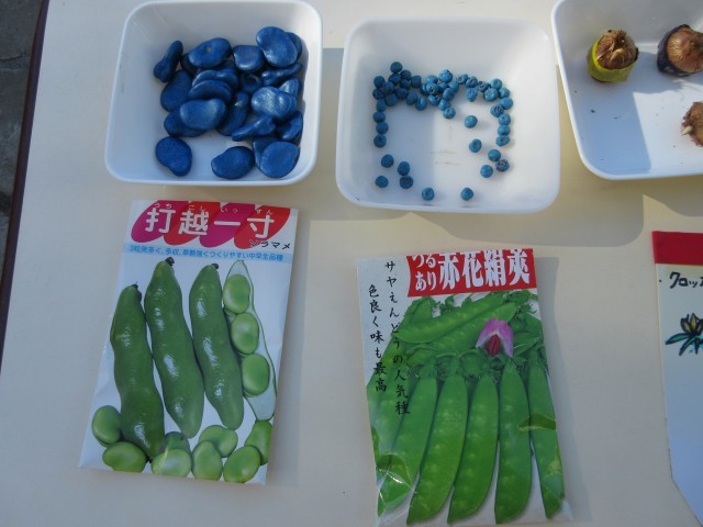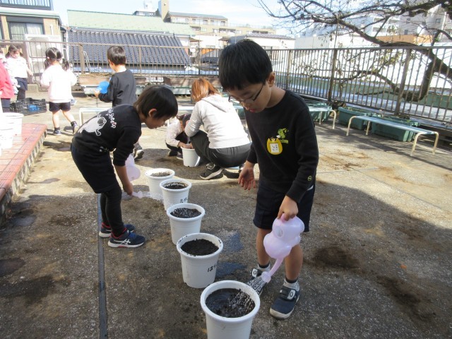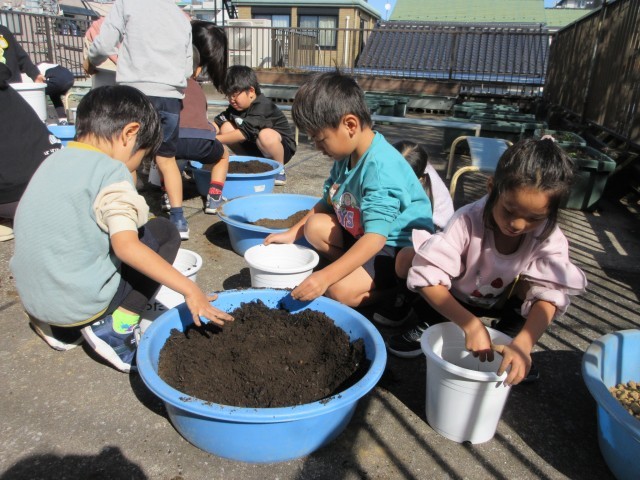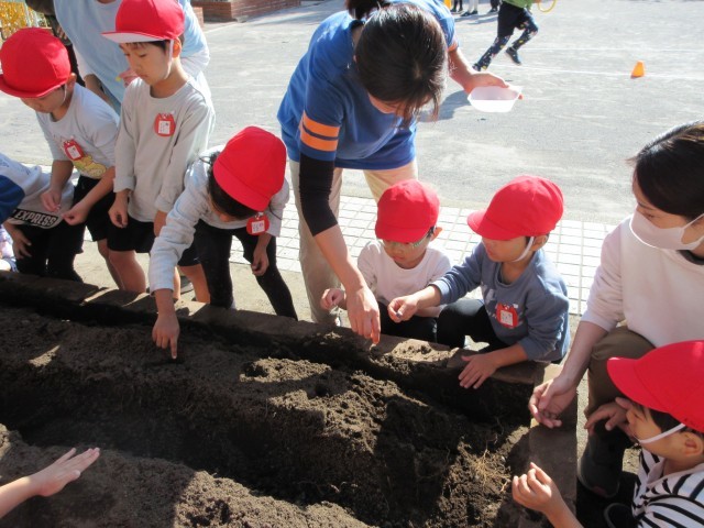 今日はいい天気。ばら組はキヌサヤとソラマメの種を、星の組はチューリップの球根を植えました。