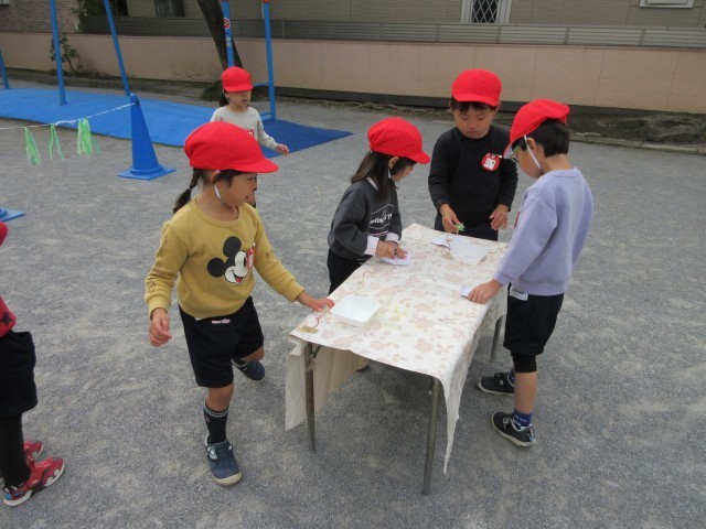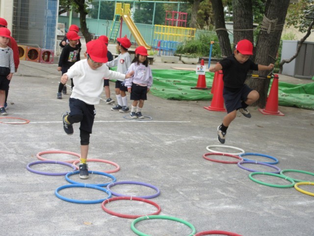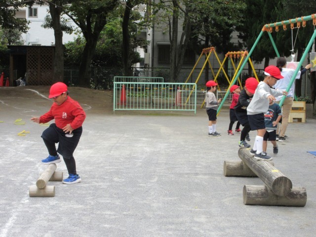 ばら組は園庭でケンパ、的にジャンプ、一本橋を渡るなど、チャレンジをして体を動かして遊んでいます。