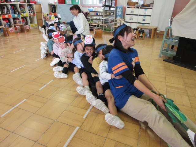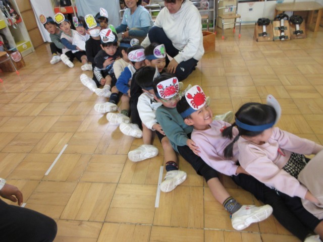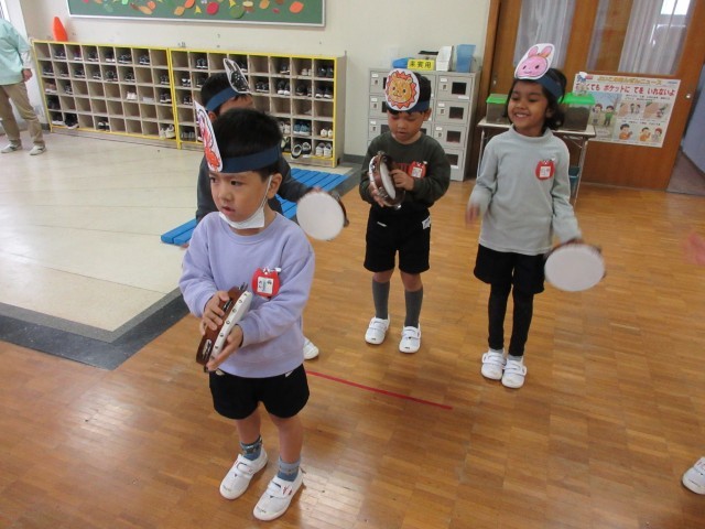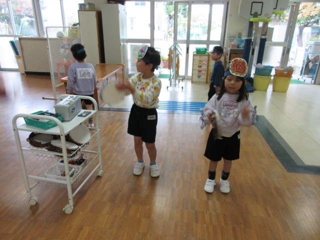 ばら組は自分で作った動物をお面をつけて遊んでいます。ダンスや楽器遊びをしたり、みんなで「おおきなかぶ」のお話に合わせて表現遊びをしたり。