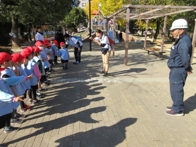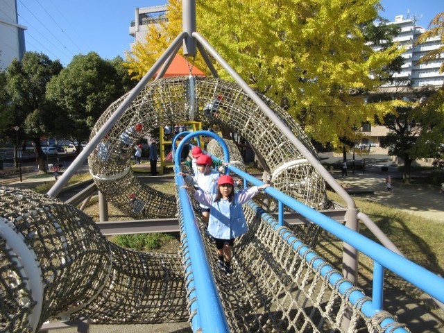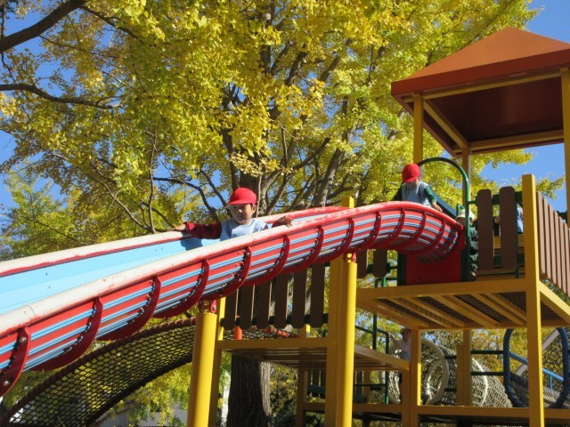 今日は秋晴れ!その後はロープ渡りや滑り台で思いきり遊びました。公園に遊びに行った際、子どもたちが植えたお花をぜひ見てください。