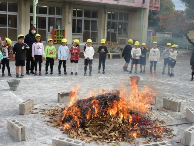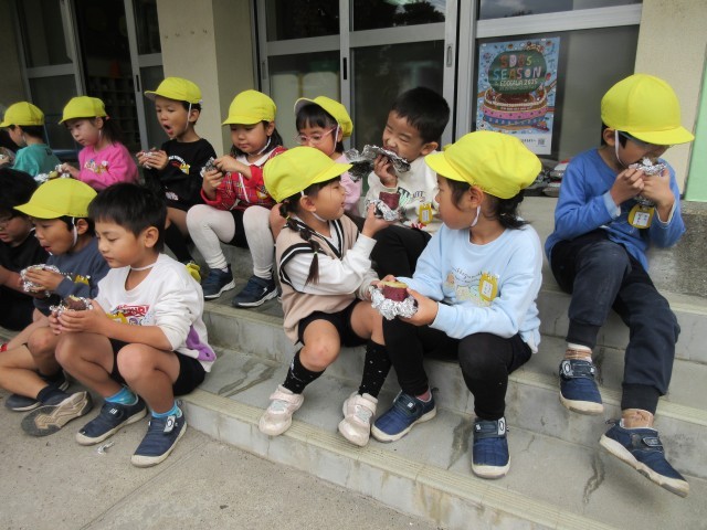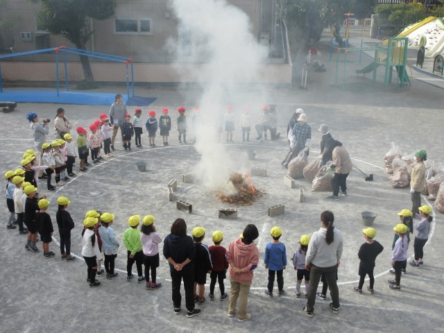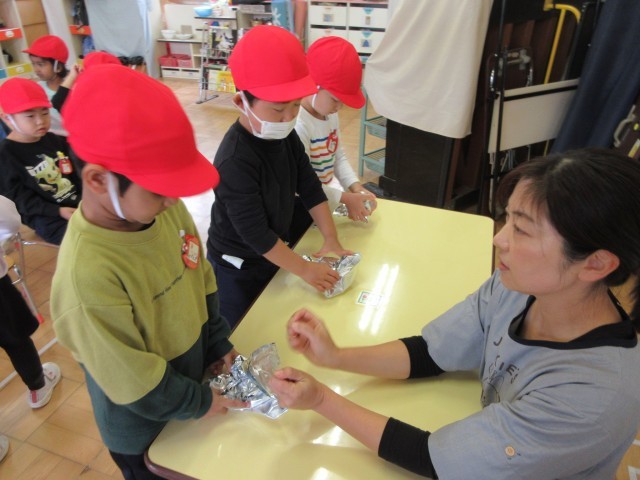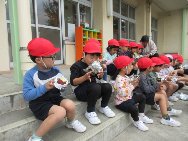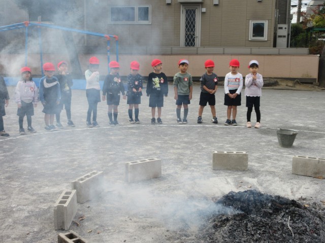 園庭でたき火をして、やきいもをしました。火をつけて落ち葉をいれると、炎と煙が上がり、みんな大喜び!自分たちでアルミホイルでサツマイモを包み、たき火の中へ入れました。できあがった焼きたてのおいもは、外で食べました。ほかほかで、甘くて、おいしかったです♪