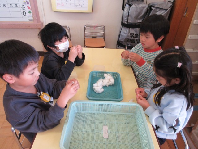 プランターで育てたワタを収穫した星の組。今日はワタの種とりをしました。フワフワのワタの中に黒い種が隠れています。